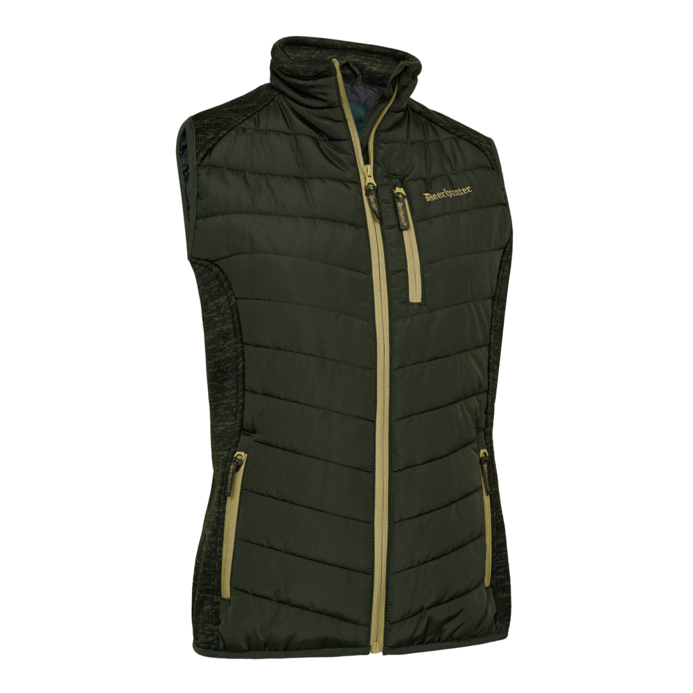DEERHUNTER Lady Moor Vatteret Vest kombinerer varme, bevægelsesfrihed og elegant design. Den er foret med DEER-TEX® Temp-isolering, som holder kroppen varm uden at føles tung – ideel som mellemlag på kolde dage eller som let yderlag i overgangssæsonen.