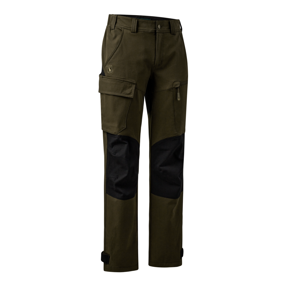 Bukserne er udstyret med en række praktiske lommer: rummelige lårlommer med klap eller lynlås, en skjult knivlomme samt justerbare ankelstropper, der sikrer en perfekt afslutning over støvlerne.